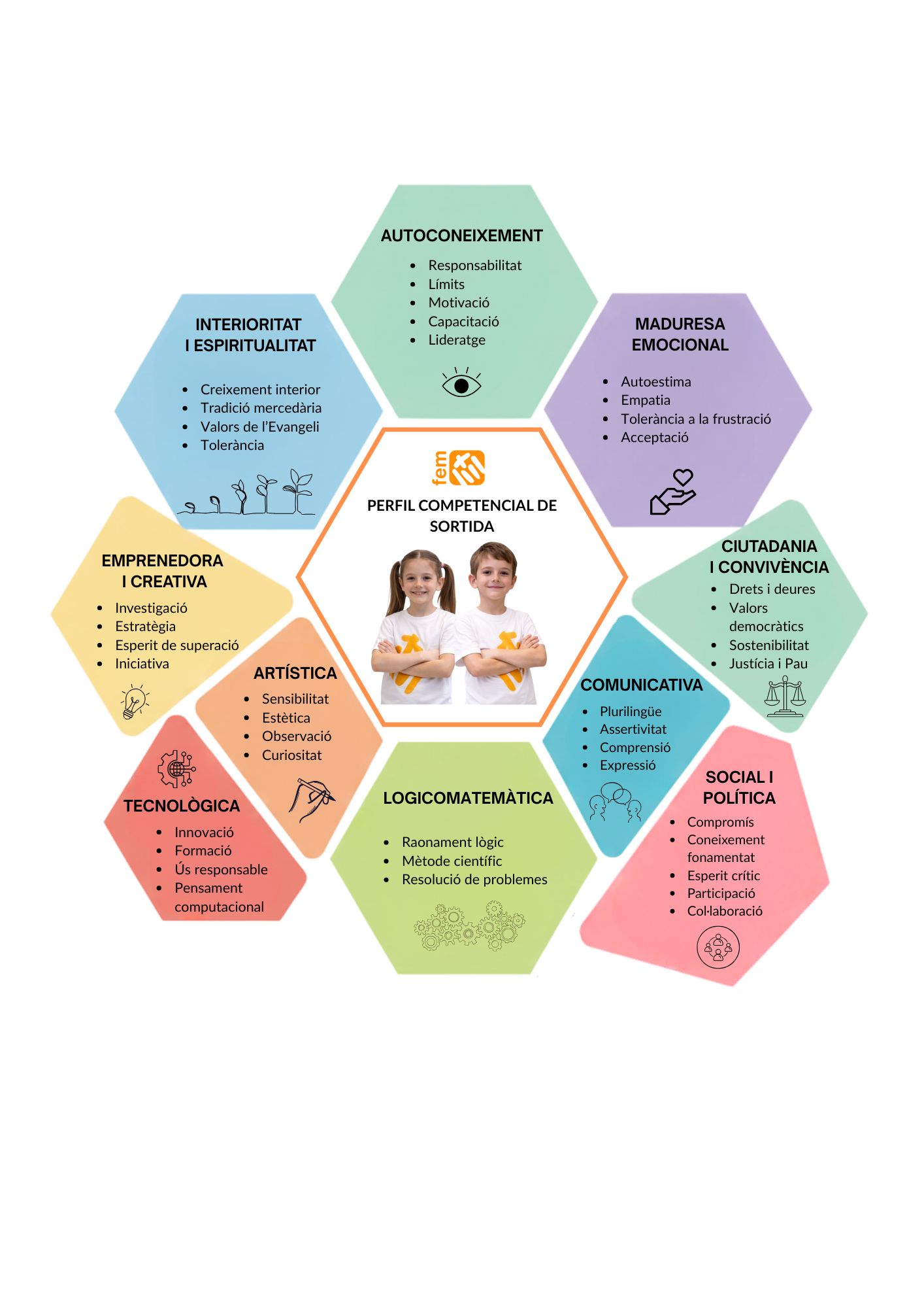 El nostre perfil competencial de sortida posa l’accent en el desenvolupament global de la persona. Destaquem l’autoconeixement i la maduresa emocional com a base per a l’equilibri personal; la comunicació i la convivència com a eines fonamentals per relacionar-se amb els altres; i el pensament lògic, científic i tecnològic com a motor per comprendre i transformar el món.