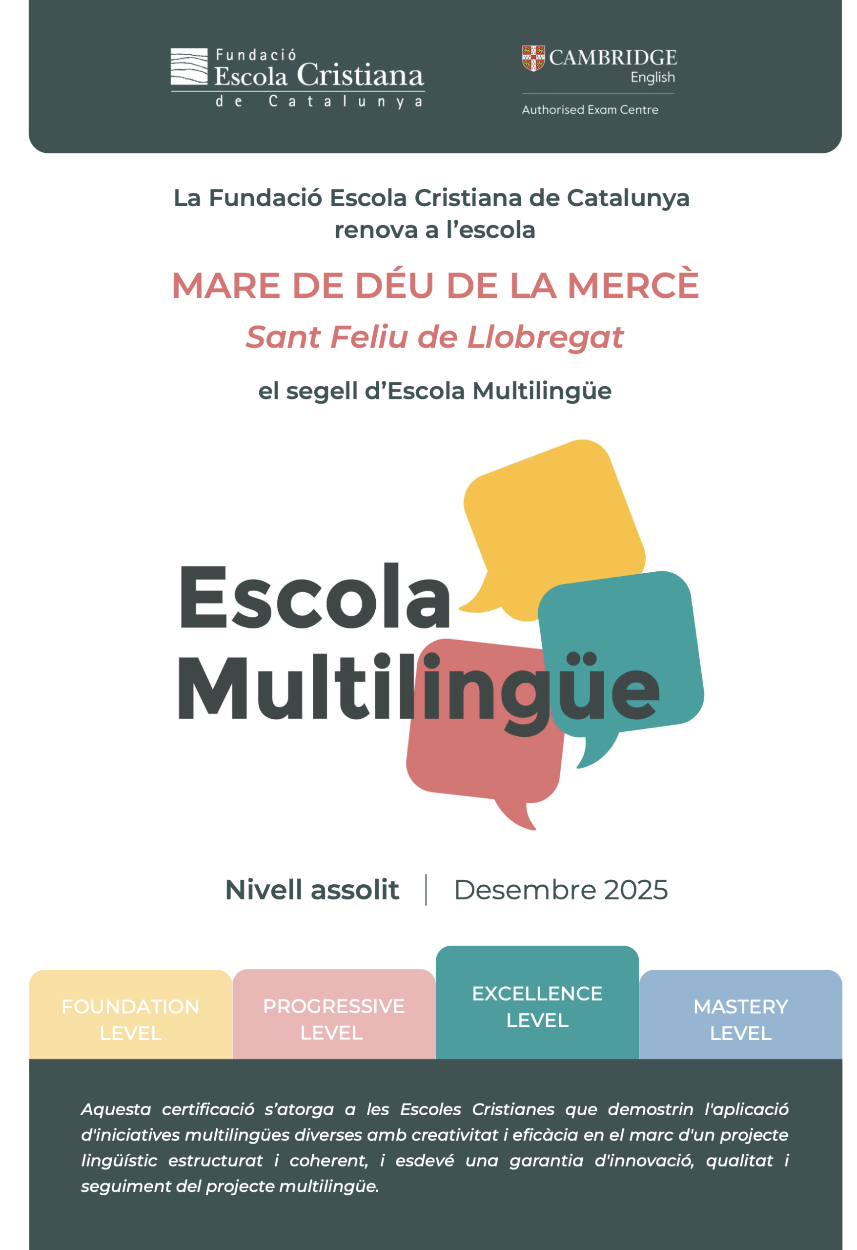 Aquest mes de desembre hem renovat el segell d’Escola Multilingüe i, aquest cop, amb nivell d’excel·lència. Aquest és un reconeixement atorgat per la Fundació Escola Cristiana de Catalunya que destaca el màxim compromís del centre amb l’aprenentatge de llengües estrangeres i la qualitat educativa.
